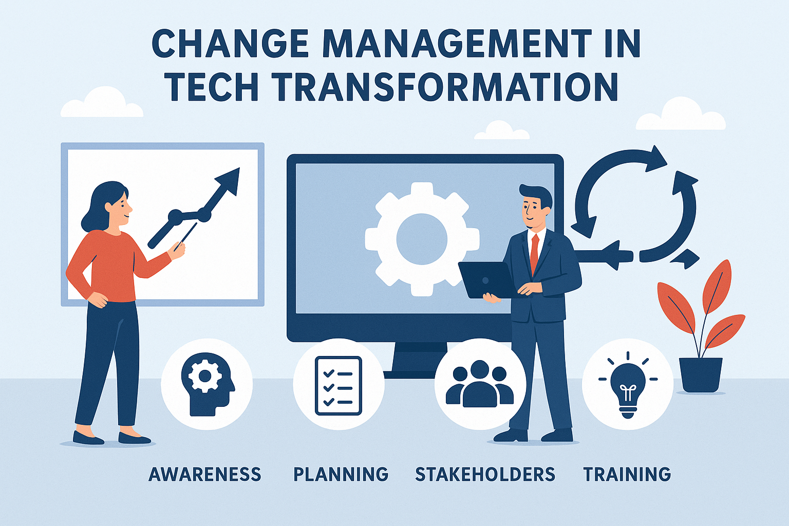 Tech transformation is more than just migrating to the cloud or adopting AI. It’s about changing how people think, work, and adapt. Without structured change management, even the best tools fail due to resistance, confusion, or cultural misfit.