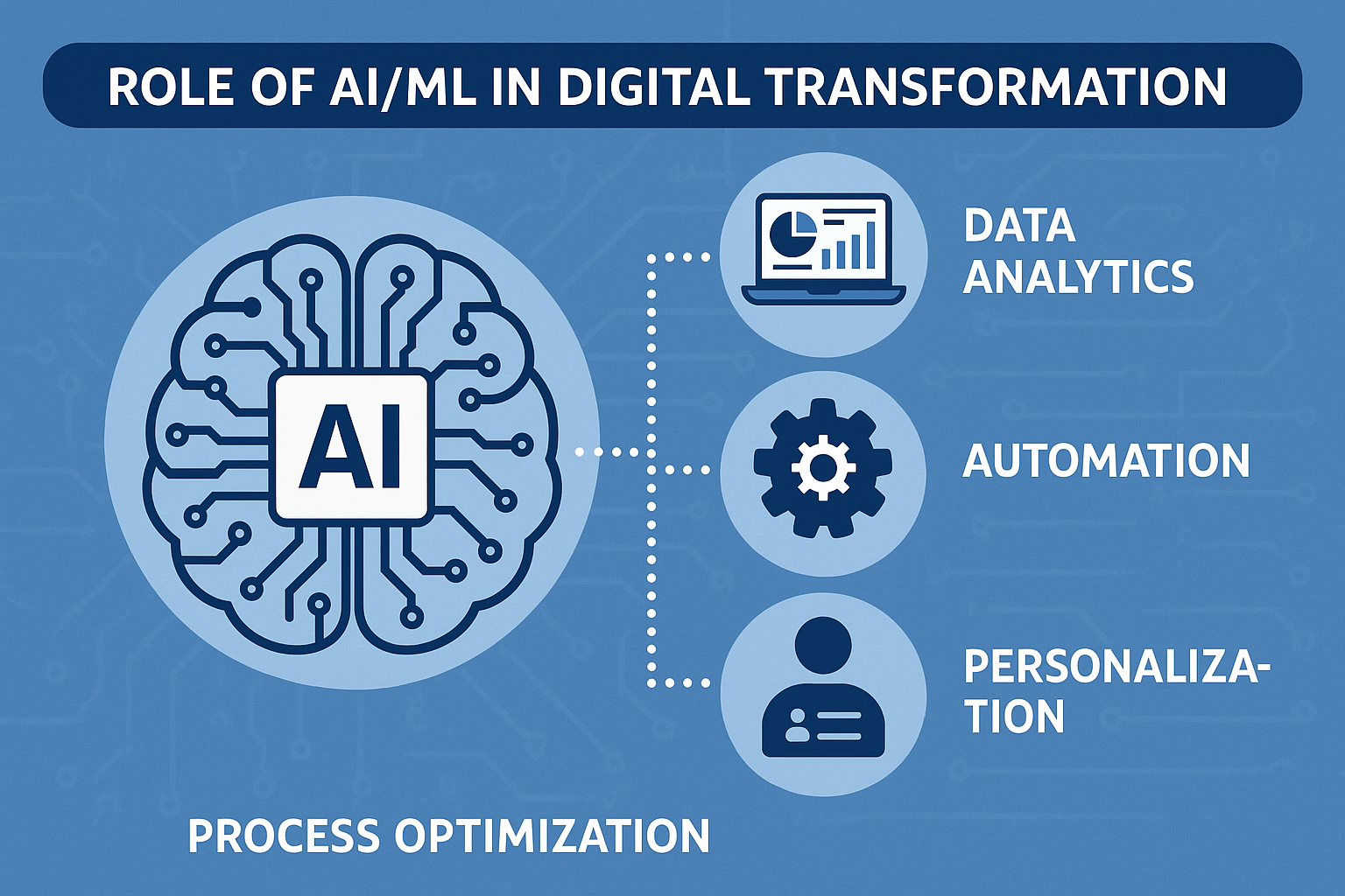Digital transformation isn’t just about digitizing processes—it’s about reinventing them for speed, intelligence, and scale. AI/ML acts as the engine of this reinvention. It turns data into decisions, automation into autonomy, and predictions into performance.